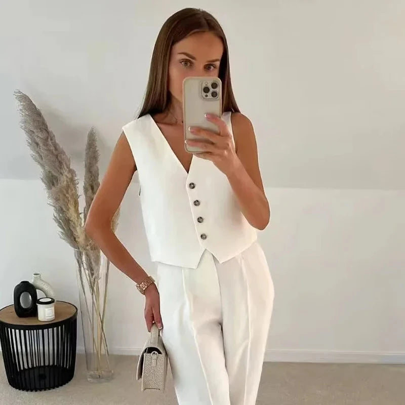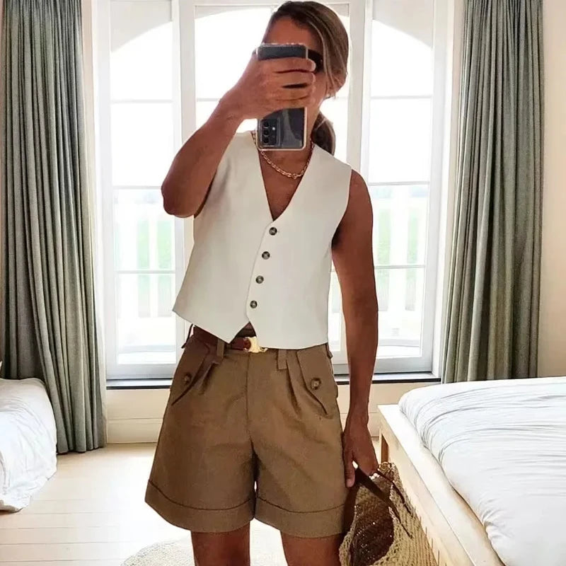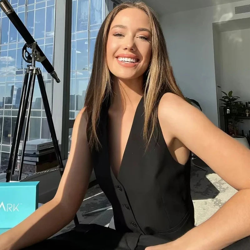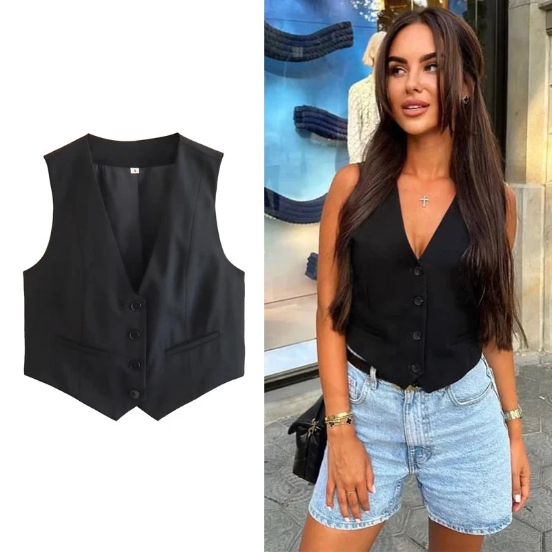 Este colete sem mangas é a combinação perfeita de moda e versatilidade. Com um design elegante e botões frontais, ele é perfeito para o escritório ou para o dia a dia. Adicione um toque de estilo ao seu guarda-roupa com este top de verão preto e branco.